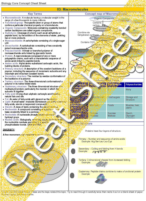 A very large molecule made up of smaller units called monomers. The monomers may be the same or slightly different. Only a few monomers can recombine to create a lot of different combinations—this gives the diversity of macromolecules. Macromolecules are formed by dehydration reactions in which water molecules are removed from the formation of bonds.