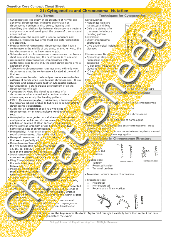 Three techniques are often used: chromosome banding, karyotyping and FISH. Certain dyes produce reproducible patterns of bands when used to stain chromosomes. Depends on the method and dye, it is classified into three types: Q band, C band and G band. Karyotyping is a standardized arrangement of all the chromosomes of a cell. FISH means Fluorescent in situ Hybridization, Using fluorescence-labeled probes to hybridize to cellular DNA for chromosome visualization.