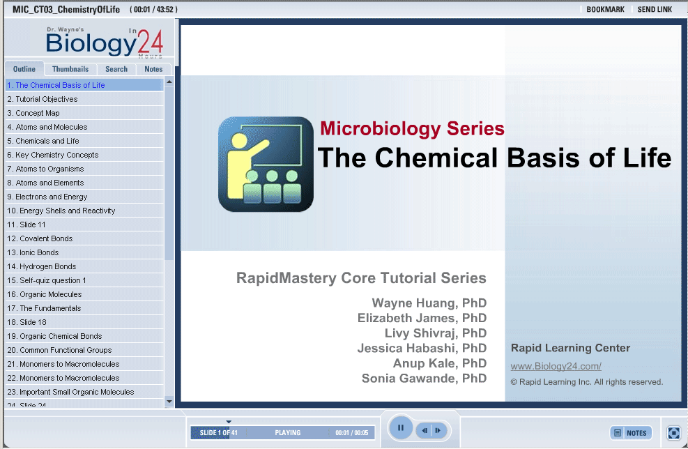 This module reviews basic inorganic and organic chemistry as well as basic thermodynamics. The make up of atoms and the basis for their reactions are described. The thermodynamics of reactions are introduced and the importance of enzymes on lowering the activation energy of chemical reactions in a cell are presented. Reactions that would normally not proceed or proceed very slowly are possible in a cell due to the effects of enzymes.