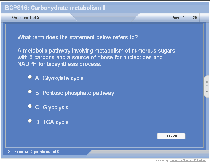 Pentose phosphate pathway (PPP) is a secondary pathway of glucose metabolism, primary being glycolysis. Glucose enters PPP as glucose 6-phosphate. It occurs in the cytosol of tissues active in fatty acid biosynthesis. Those tissues are liver, mammary and adrenal glands and adipose tissue. There are two phases in the pathway: oxidative and non-oxidative. There are four steps involved in oxidative phase, during which glucose-6 phosphate gets converted to ribose 5-phosphate. In the non-oxidative phase, transaldolase and transketolase enzymes catalyze the reversible reactions for the regeneration of glucose 6-phosphate.