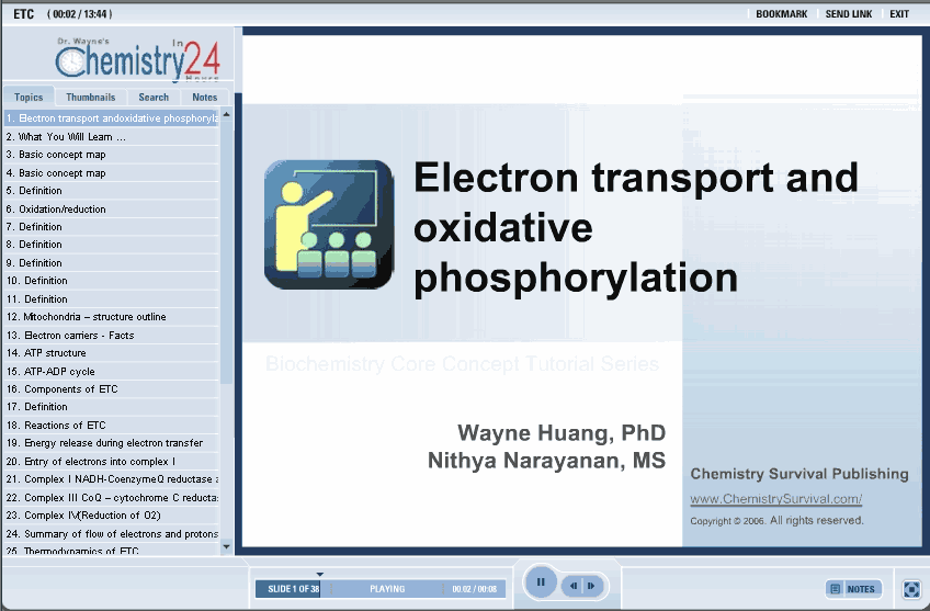 Coupling of ATP synthesis to electron transfer via an electrochemical H+ gradient across a membrane is called chemiosmosis. Energy from electron transport drives an active transport system which pumps protons out of the mitochondrial matrix into inter- membrane space. An electrochemical gradient of protons is created, with a lower pH value outside the inner mitochondrial membrane than inside. The protons on the outside have a thermodynamic tendency to flow back in, so as to equalize pH on both sides of the membrane.