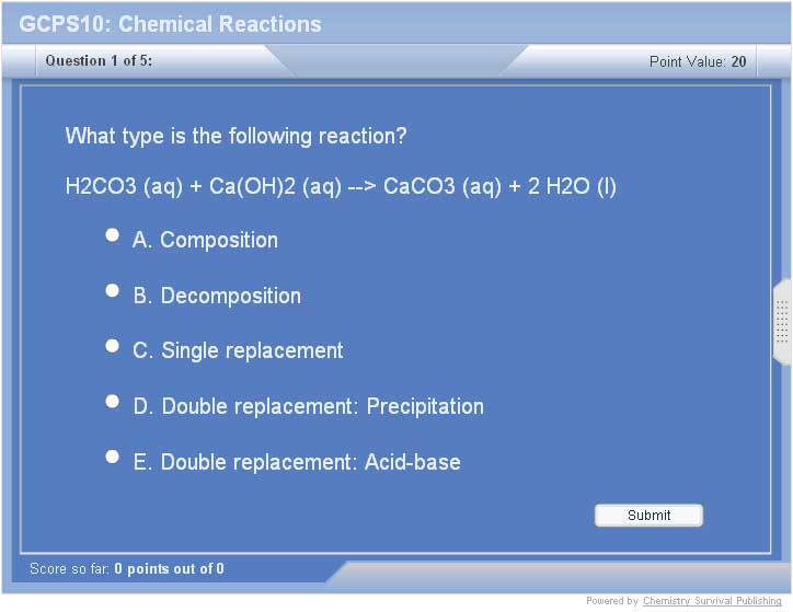 Chemical reactions are the “sentences” of chemistry that show what molecules enter a chemical change and what molecules are produced in the change.  The tutorial will introduce the components of a chemical reaction, the common types of chemical reactions and how to predict products of simple chemical reactions