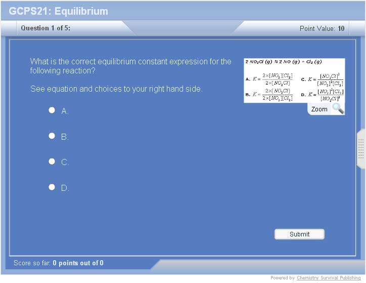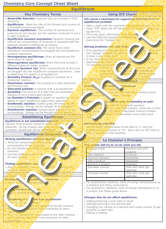 Equilibrium constant expressions are the ratio of the concentrations of products to reactants using their coefficients from the balanced equation as exponents. Pure solids and liquids are not included in the equilibrium constant expression. Equilibrium concentrations are plugged into the expression to solve for the equilibrium constant. A large equilibrium constant means that the reaction “lies to the right” with more products than reactants at equilibrium. A small constant means that the reaction “lies to the left” with more reactants the products present at equilibrium.