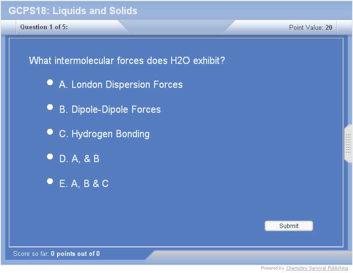 Liquids and solids are condensed states of matter.  This tutorial introduces the intermolecular forces between molecules in the condensed states.  Properties, such as Vapor Pressure, are explained.  The various types of solid structure are shown.  Changes in state, and the energy associated with them, are also discussed.