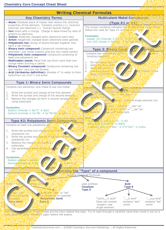 Between a metal and a non-metal and they’ll end with “-ide” on the second word. The metal’s symbol and charge are written, followed by the non-metals’s symbol and charge. The charges are balanced by using coefficients to indicate the number of atoms.