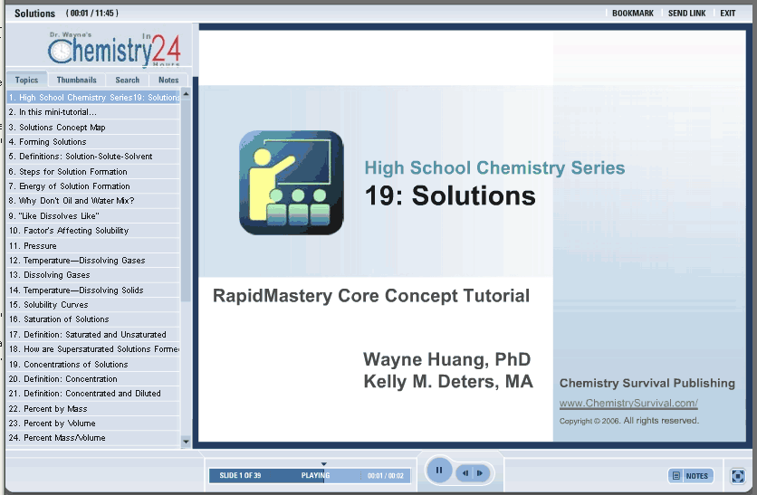 • Animations of concepts such as factors affecting solubility, dilutions, vapor pressure of a solid and colloids exhibiting the Tyndall Effect