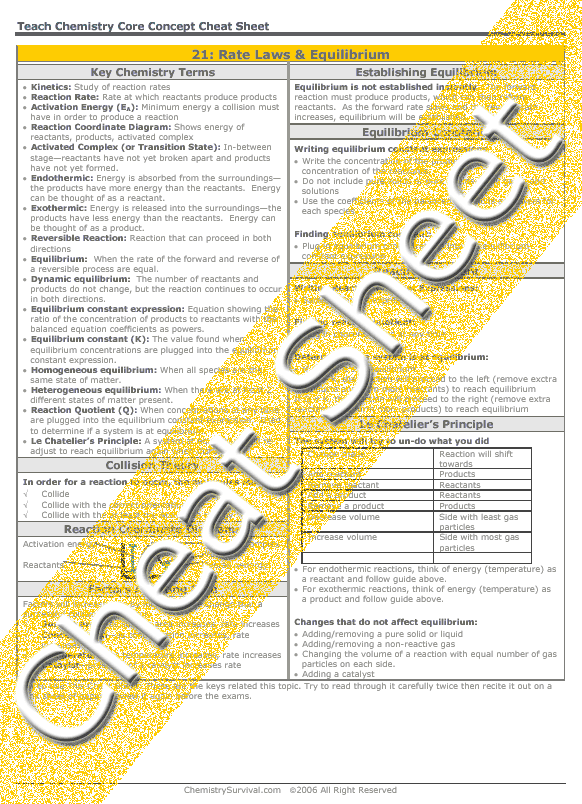 Equilibrium constant expressions are the ratio of the concentrations of products to reactants using their coefficients from the balanced equation as exponents. Pure solids and liquids are not included in the equilibrium constant expression. Equilibrium concentrations are plugged into the expression to solve for the equilibrium constant. A large equilibrium constant means that the reaction “lies to the right” with more products than reactants at equilibrium. A small constant means that the reaction “lies to the left” with more reactants the products present at equilibrium.