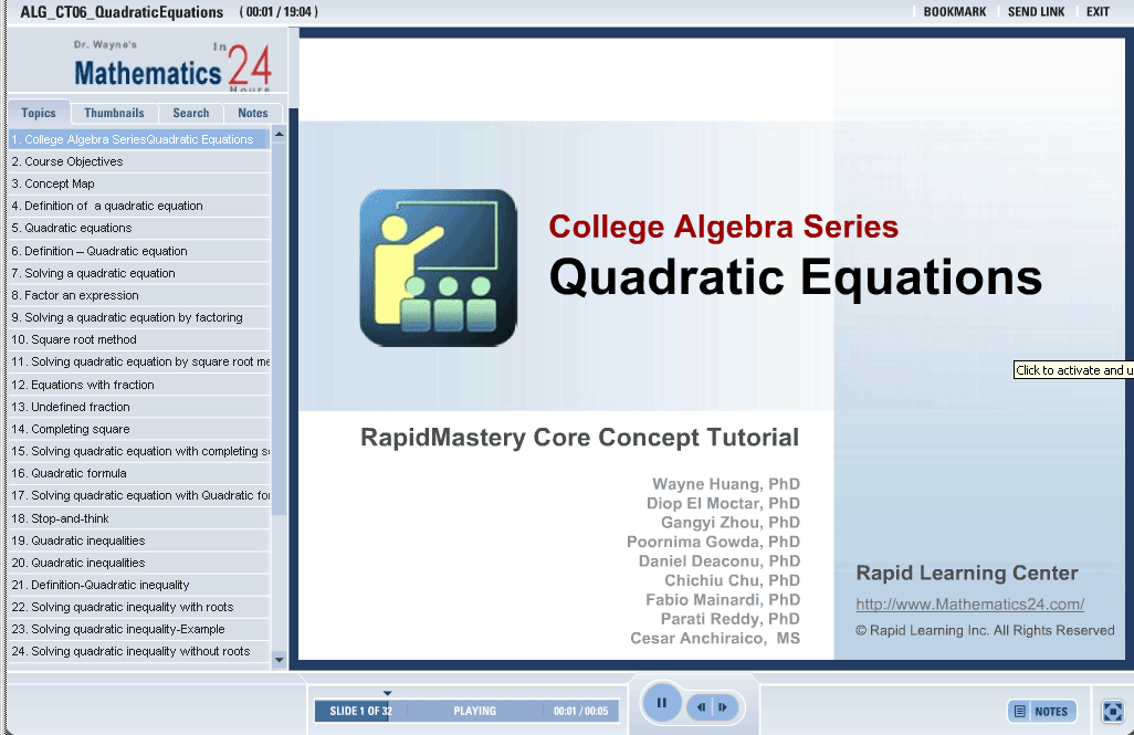This tutorial describes what a quadratic function is and its properties. The square root method is used to solve quadratic equations. Important principles such as completing the square of a quadratic equation are shown with the use of examples. The quadratic formula and the conditions under which it is used are described in this tutorial.