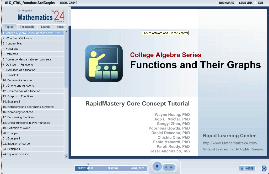 This tutorial describes what a function is and its properties. Graphing a function allows for the discussion of specific function properties such as transformations of functions, composite and inverse functions.