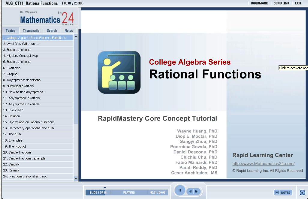 Basic definitions of rational functions Domain of rational functions Asymptotes of rational functions Formula Operations on rational functions Simple rational functions Simplification of rational functions Polynomial equations Solving polynomial equations