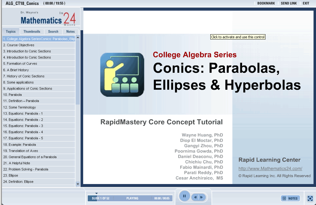 Introduction to Conic Sections A Brief History of the Conic Sections Some applications Parabola Definition of a parabola Different types of equations of a parabola Ellipse Definition of an ellipse Relationship between foci and axes Different types of equations of an ellipse Hyperbola Definition of a hyperbola Relationship between foci and vertices Mechanical vs. electromagnetic waves Different types of equations of a hyperbola Asymptotes of a hyperbola |