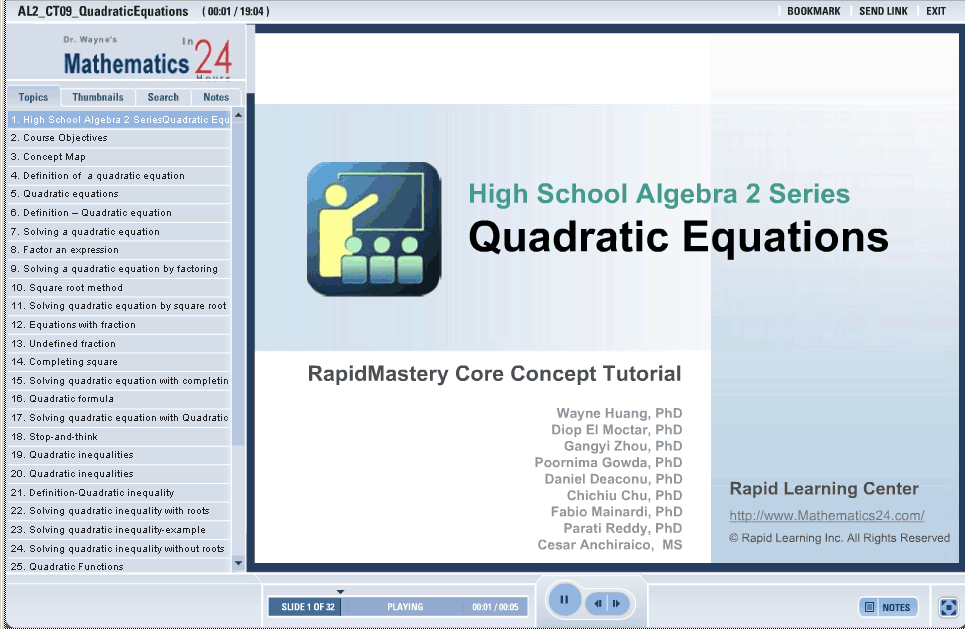 • Step by step examples are shown to introduce quadratic equations, square root method, and graphs of quadratic functions.