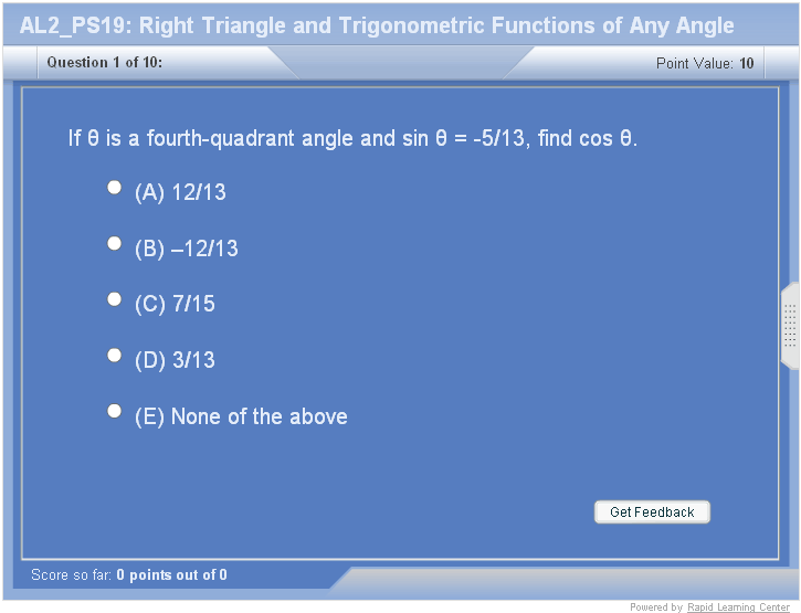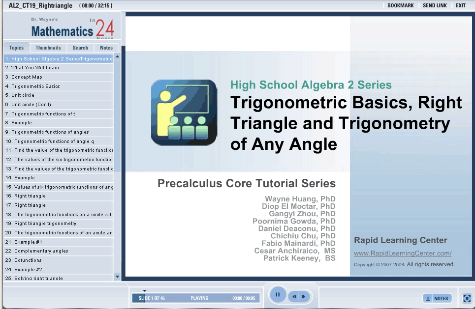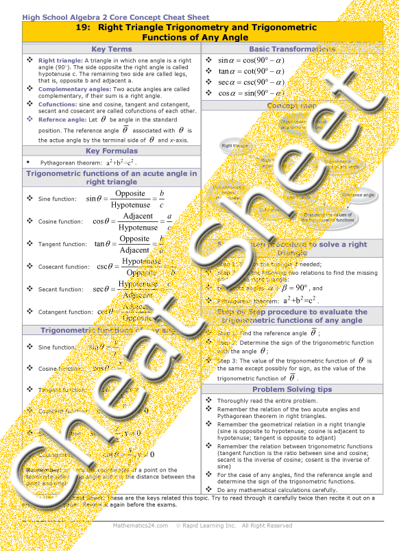 This tutorial describes right angle trigonometry in a variety of ways.  First, the trigonometric functions of acute angles are mentioned along with the complementary angle theorem. Solving right triangles is shown with the use of examples and trigonometric functions on a circle with radius r.