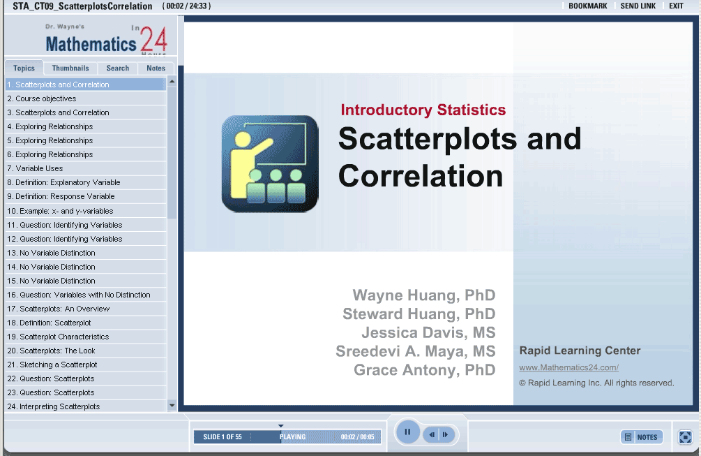 This tutorial describes what scatterplots and correlation are and their properties. First, we identify the role of variables on the x and y axis then we identify and create scatterplots and describe the overall pattern of a scatterplot using direction, form and strength.