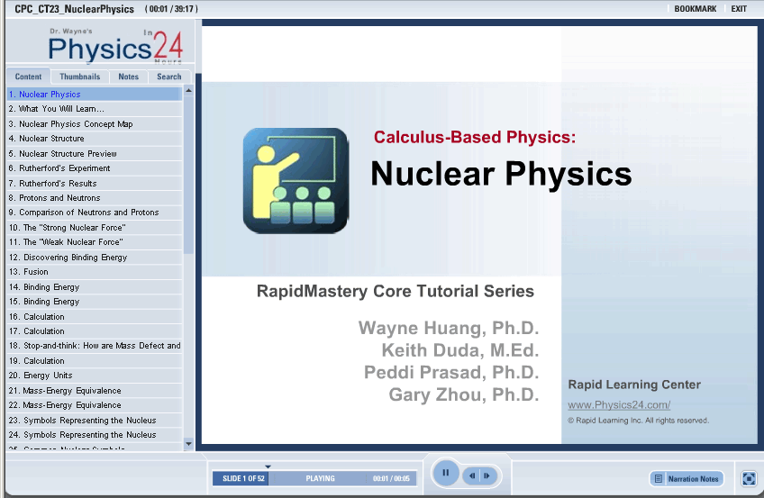 This tutorial specifically describe the structure and behavior of the atomic nucleus.  The nucleus is composed of neutrons and protons.  Obviously the similarly charged protons repel each other, but nuclear forces usually overcome that tendency and the nucleus is kept intact.  However, sometimes that repulsion is too great and the nucleus crumbles apart.  This is the process of radioactivity.  Alpha, beta, and gamma are the three types of nuclear radioactivity.  Each has different properties.  A nucleus may also break apart into roughly two equal pieces, this is the process of nuclear fission.