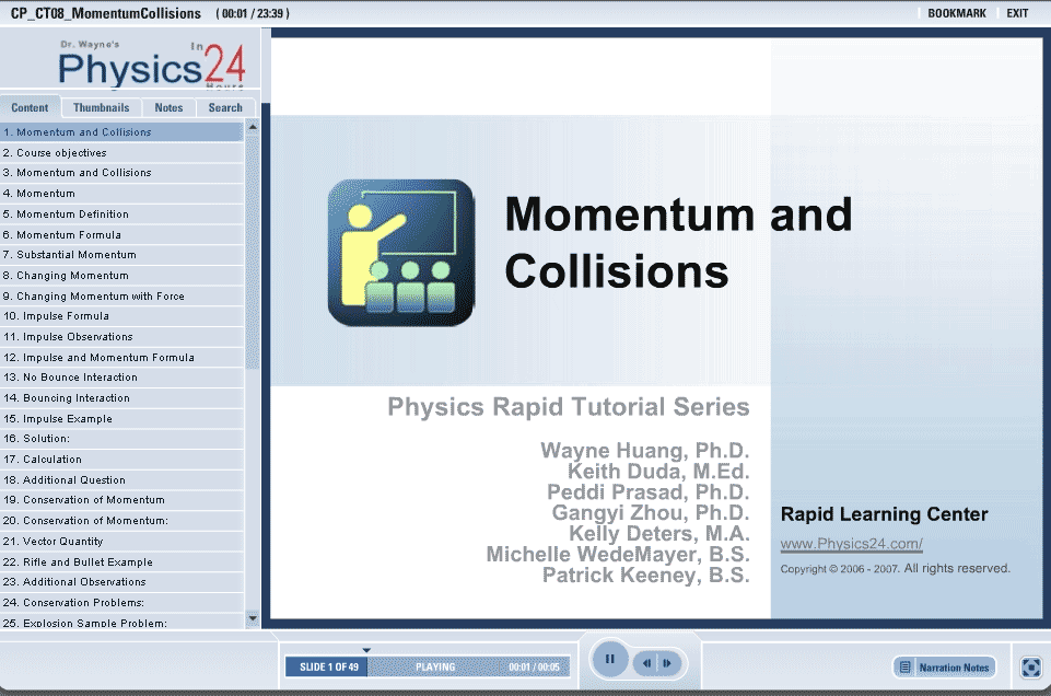 This tutorial describes the concept of momentum.  This is very similar to inertia in motion.  Once a moving object has momentum, it may be changed and brought to a halt.  This change in momentum is called impulse.  Anytime there is some type of collision or interaction, momentum is transferred.  This tutorial describes three main types of momentum collisions: hit and stick, hit and rebound, and explosion.  In all of these, the conservation of momentum is observed.  Momentum isn’t created or destroyed, its just transferred from one item to the next.