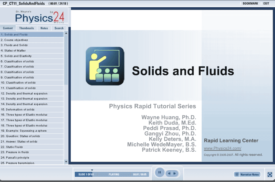 This tutorial covers two topics, solids and fluids.  The difference between the ordered atomic structure of crystalline solids, and the random nature of amorphous solids is discussed. Other properties of solids like thermal expansion and various deformations of solids are covered too.  Next the nature of fluids is described through key concepts like Pascal’s, Archimede’s, and Bernoulli’s principle.  Finally, fluid flow is described.  Smooth laminar flow and chaotic turbulent flow are contrasted.  This idea is extended with Bernoulli’s equation which describes the relationship between the pressure, kinetic and potential energy in a system as a constant.