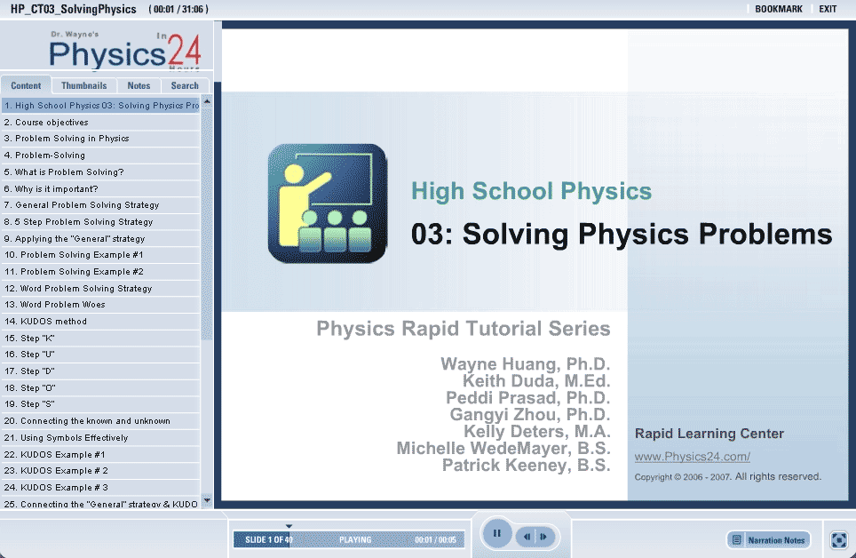 Problem solving doesn’t just apply to working out physics problems.  It applies to many academic and real life topics.  This tutorial gives a very general outline to help attack any type of problem.  A common difficulty with science classes is the dreaded word problem.  The KUDOS method gives the student a place to start and a step by step method to begin the solution.  KUDOS stands for known, unknown, definition, output, and substantiation.  In addition to problem solving, this tutorial give hints to succeed on tests.  Multiple choice, free response, and essay tips are all covered.